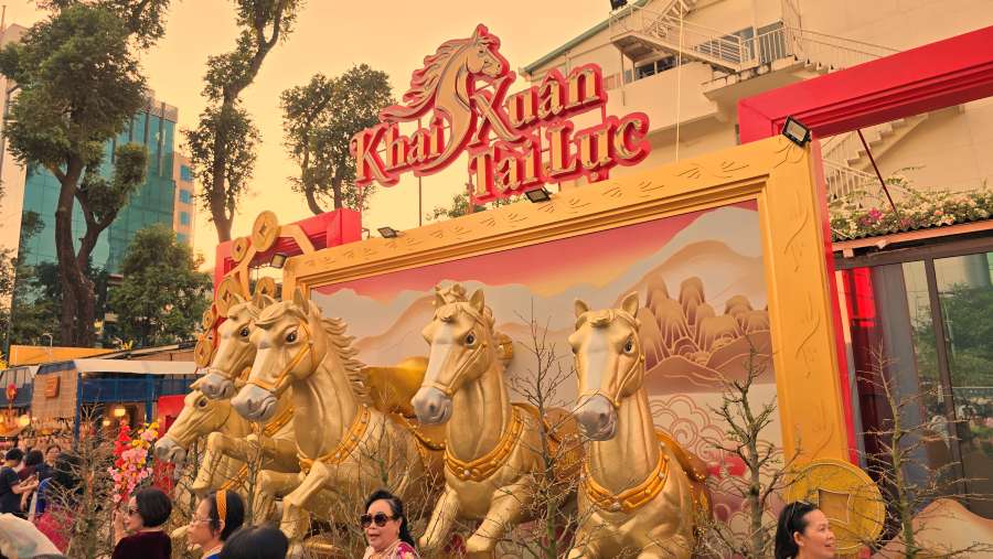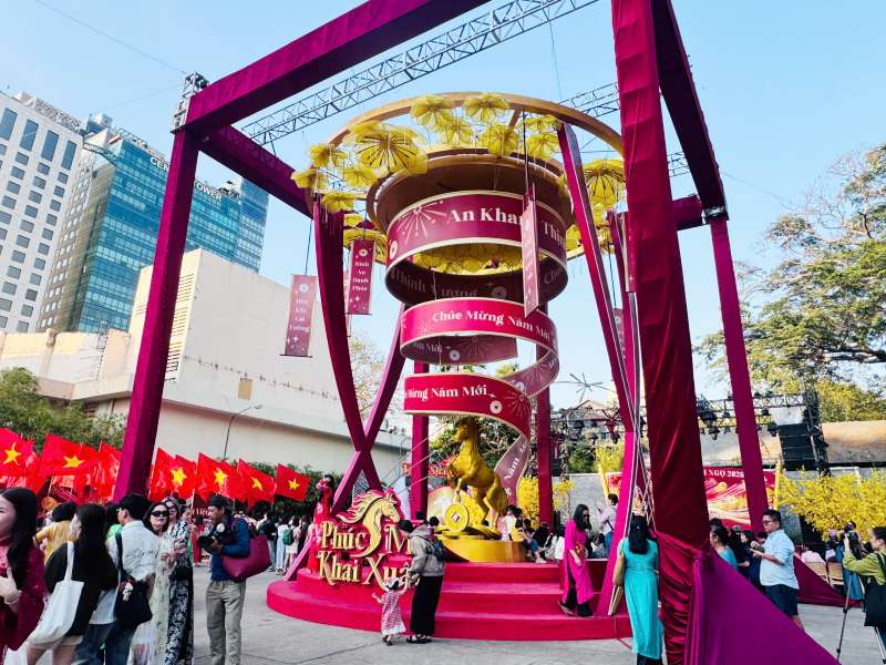 Tại lễ khai mạc, ông Nguyễn Hồng Phúc, Giám đốc Nhà văn hóa Thanh niên TP.HCM cho biết, Lễ hội Tết Việt Bính Ngọ 2026 do Nhà Văn hóa Thanh niên TP.HCM tổ chức diễn ra từ ngày 1/2 đến 21/2 (tức 14 tháng Chạp đến mùng 5 Tết), tại số 4 Phạm Ngọc Thạch, phường Sài Gòn.Mô hình linh vật Ngựa bay, vươn mình từ đóa mai vàng rực rỡ tại cổng chính thu hút người dân trước thềm năm mới